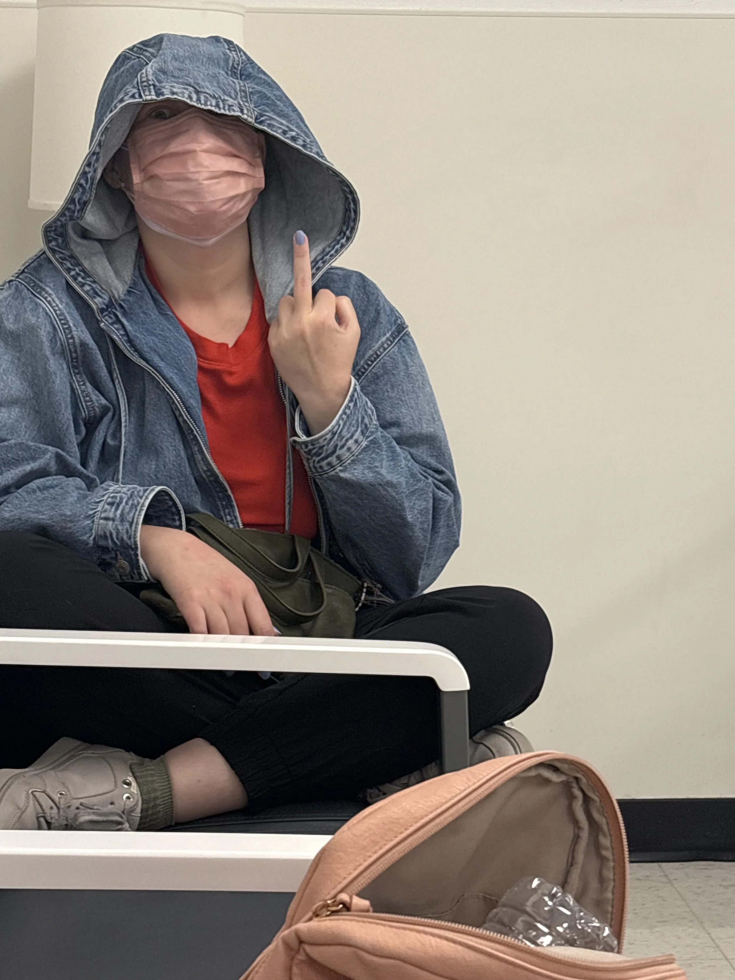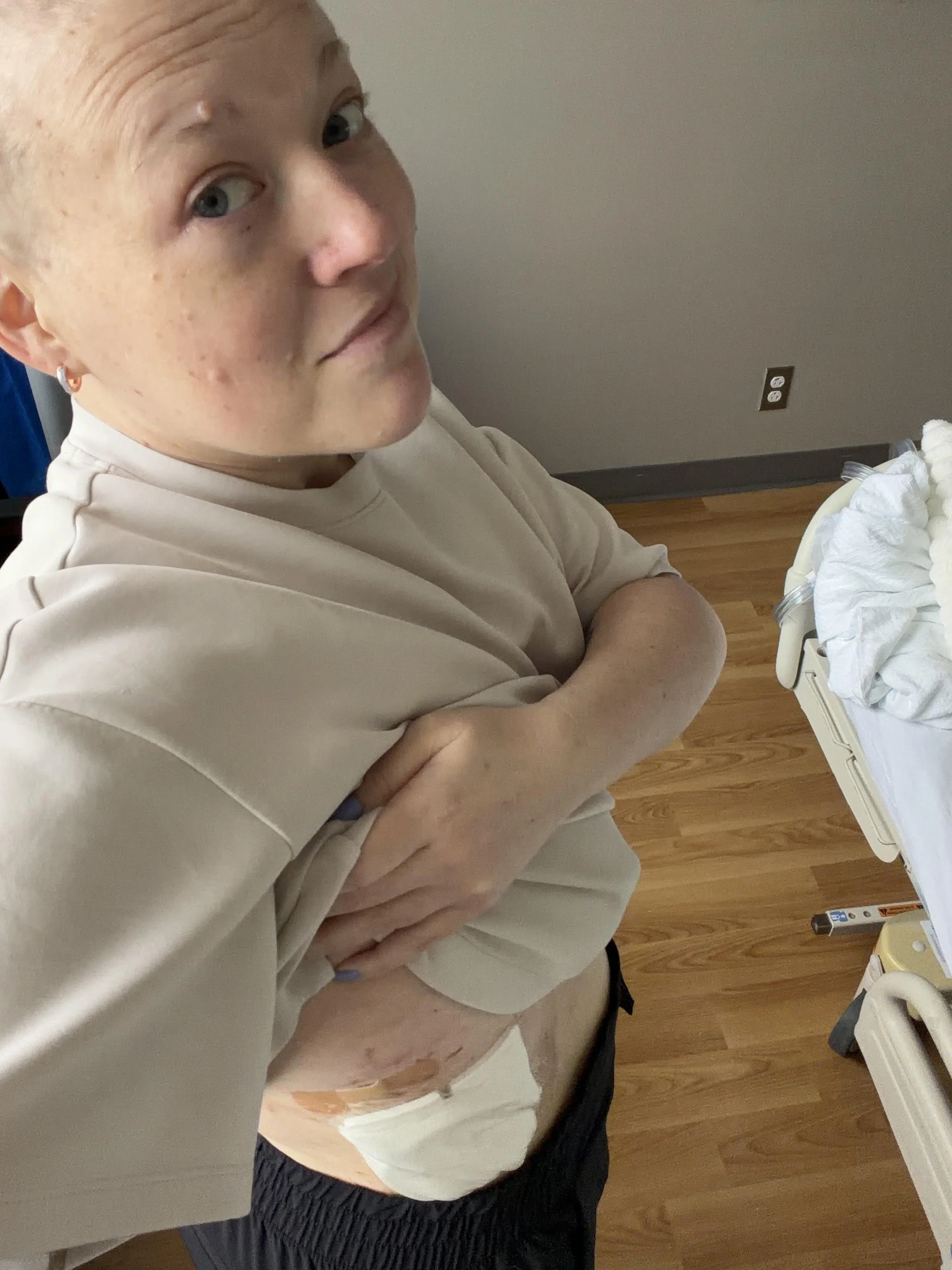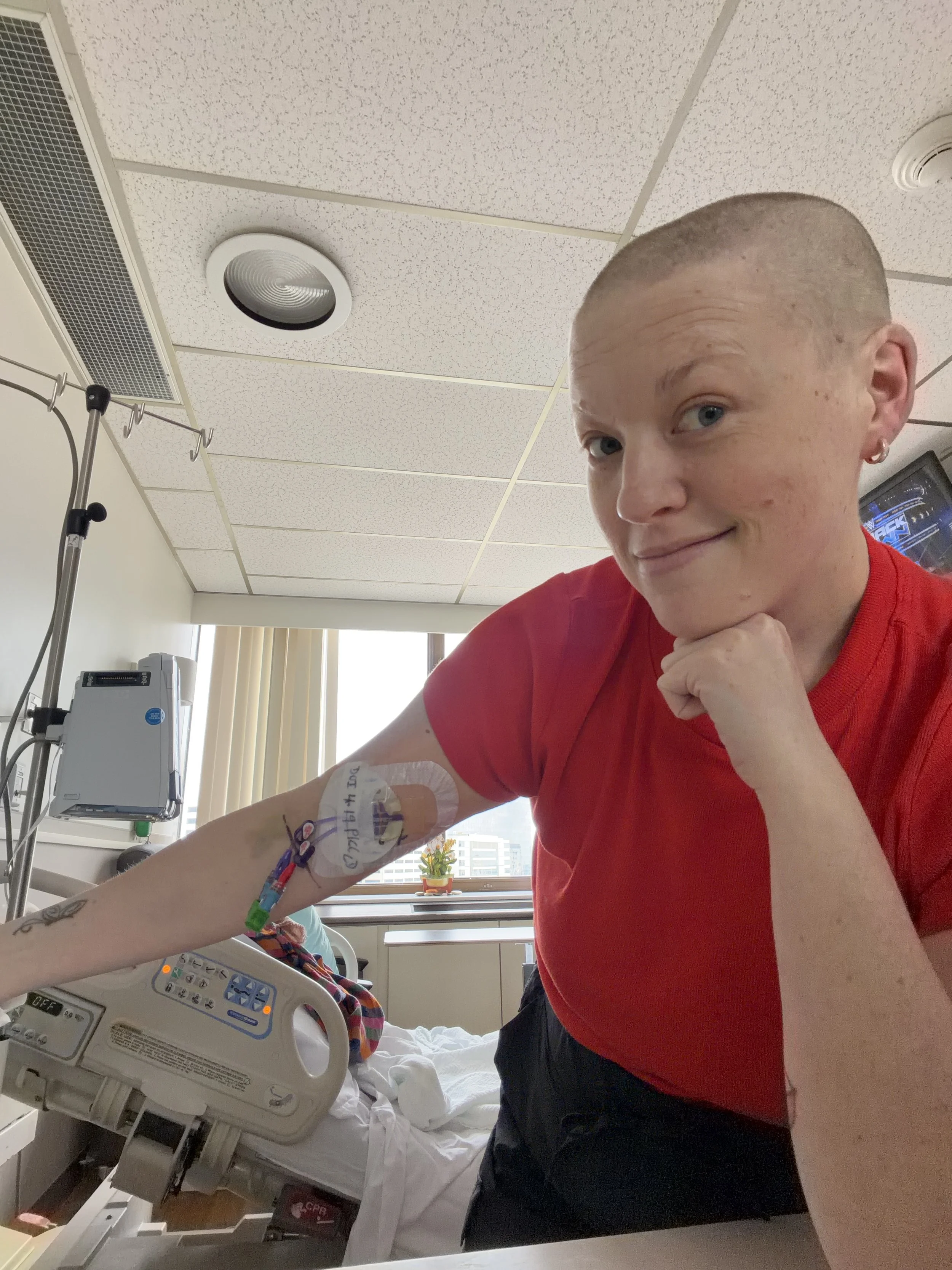 Did you know: this indwelling tube is placed to drain recurring, excess fluid buildup (pleural effusion) caused by cancer. When I first arrived in the hospital in March, the drain couldn’t drain fast enough. This fluid around my heart and lungs explained why I couldn’t catch my breath. With each drain, they pull less and less fluid. The chemo treatment is working! I will admit, the draining is painful AF. A bit like a stabby stabby stab between my ribs as a vacuum pulls out the fluid and the air inside me with it. I curl up like a spider on its back. One day, I will bid her adieu. Until then, the PC and I shall carry on together.